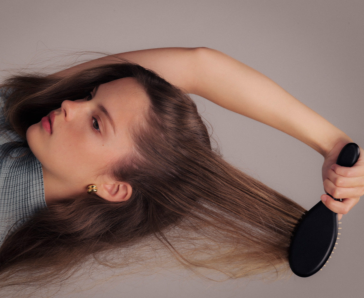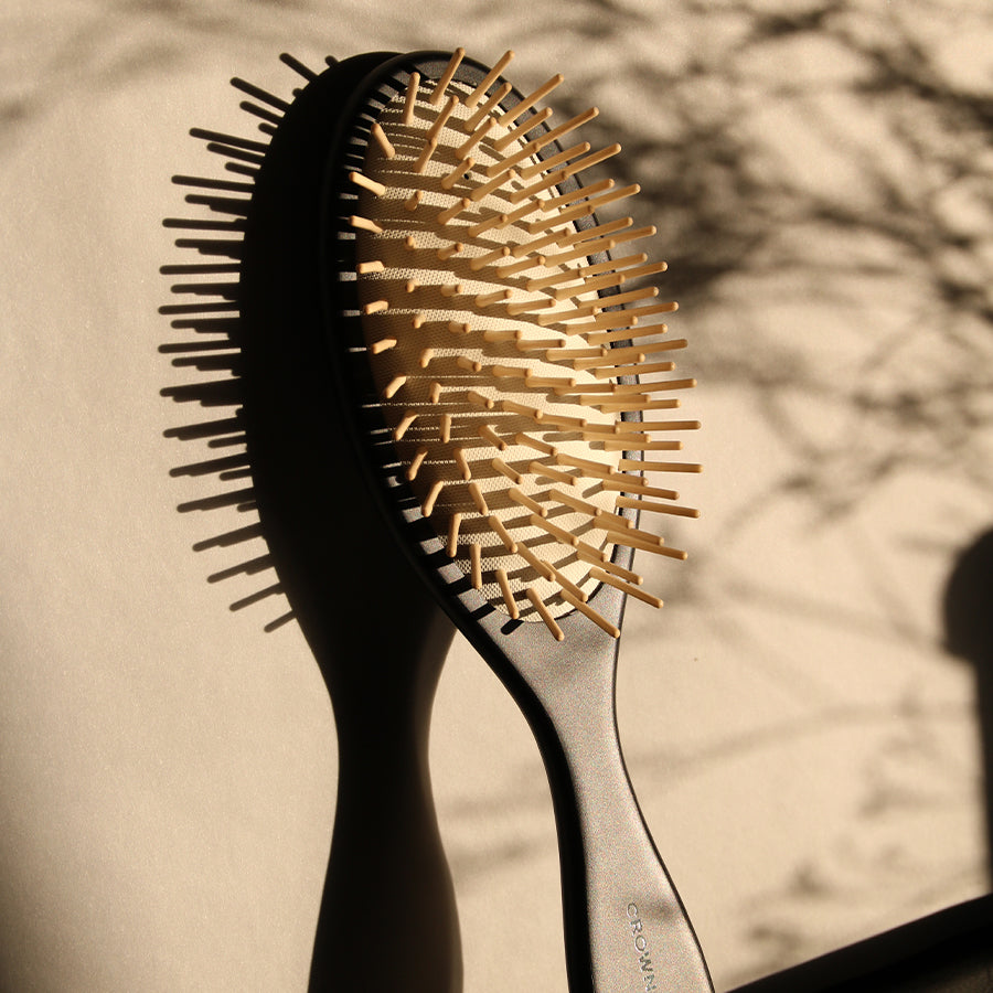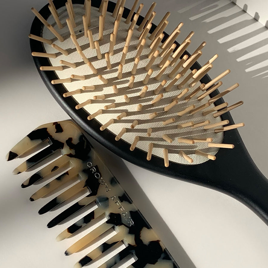 A wooden pin detangling brush for all hair types.