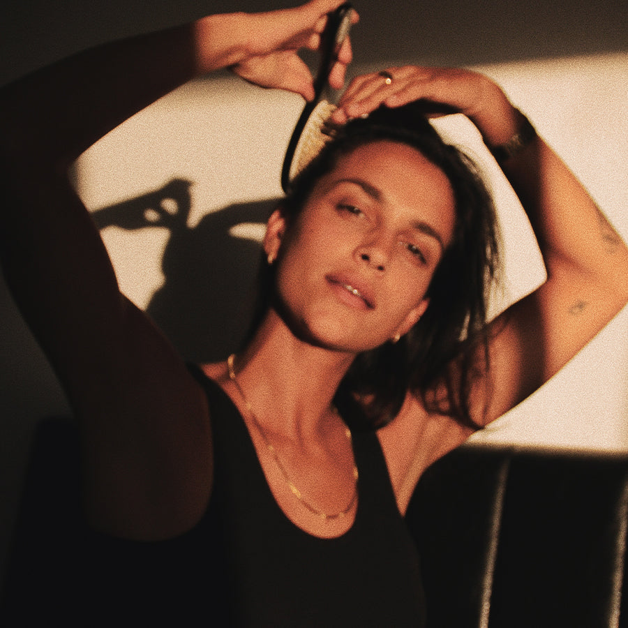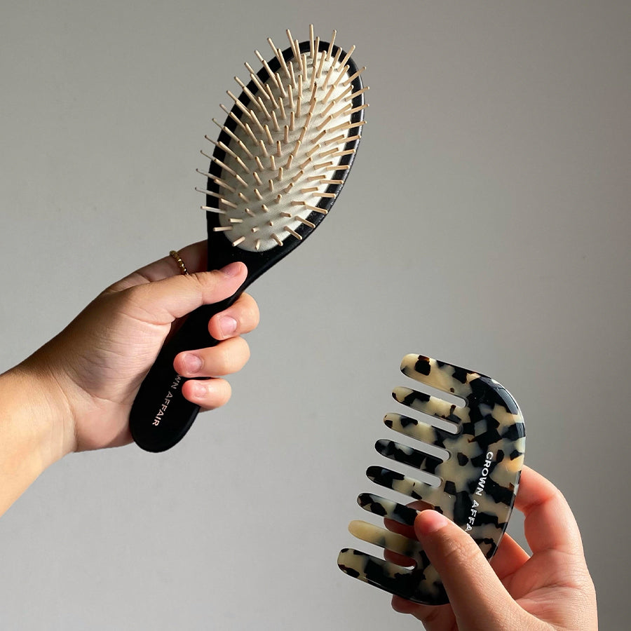 A wooden pin detangling brush for all hair types.